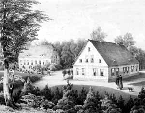 | Die Anhöhe mit 36,0 m ü. NN gleicht ungefähr der des Kulms. In der Chronik von Heringsdorf schreibt Pastor Hartwig: "Von hier aus spähte die Wirtin nach dem Strande, um die Ankunft der Reisenden zu erkennen, die von Swinemünde aus zu Wagen den Strand entlang fuhren. Dann kochte Sie eiligst Kaffee, an dem sich die Ankommenden erquickten". Den Weg, wie er auf der Lithographie zu sehen ist, verlief damals von der Kulmstraße nach links hinter dem Marktplatz mit dem Pferdestall direkt zum Gesellschaftshaus. Wo heute die Reha-Klinik "Am Kulm" steht befand sich damals der Marktplatz von Heringsdorf. In den ersten Jahren Heringsdorf's war das Gesellschaftshaus, die Adresse für Besucher und Gäste zum Speisen und Trinken, ein Sammelpunkt der vornehmen Gesellschaft. Im Jahre 1926 wurde das Gesellschaftshaus abgerissen. | |